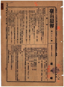 三六 第二号 台湾害虫駆除予防規則第二条第二項ニ依リ甘蔗露菌病臨時駆除予防方法及其ノ施行地域ヲ定ムルニ伴ヒ明治四四年一二月台南庁令第一八号ヲ廃止ス