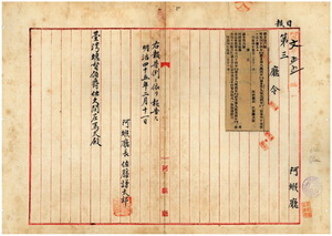 四五 第六号 明治四四年七月庁令ノ第八号・第九号ト同四四年一一月庁令第一五号ノ阿緱庁港西中里ノ阿緱街・崇蘭街・海豊庄ヘノ牛畜ノ出入往来停止ニ付キ廃止ノ件