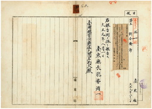 九 第一号 明治四二年一二月台東庁訓令第一七号判任官各官定員中属ト技手ヲ改正並ニ明治四五年五月台東庁訓令第一二号判任官各官配置定員中財務課属ト技手ヲ改正ス