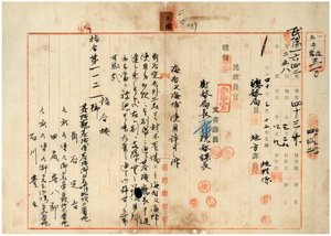 二四 角谷定吉・田尻与八郎・石川豊之ヨリ出願ノ材木置場トシテ基隆堡牛稠港庄ニ建物建設並ニ五年間ノ海埔使用許可ニ関スル件(指令第一一二一号)