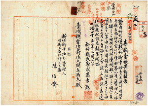 二八 新竹庁長家永泰吉郎ヨリ新竹庁竹北一堡新竹街中抽分管理人ニ関シ同街土名北門陳信斉ヘノ変更ニ付キ神明会台帳異動報告ノ件