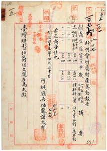 一五 神明会所属財産タル阿緱庁港西中里帰来庄ノ観音媽会ノ畑地ヲ三筆分割ノ為メ異動ニ付キ阿緱庁長佐藤謙太郎ヨリ報告ノ件