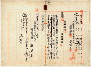 一〇 台北庁基隆堡基隆街聖王公廟管理者ノ林栄欽・張達源・蔡天培ヨリ出願ノ聖王廟所属ノ土地ヲ基隆高砂公園地トシテ処分方許可(指令第一七七五号)及ヒ同廟財産異動ニ付キ台北庁長井村大吉ヨリ報告ノ件
