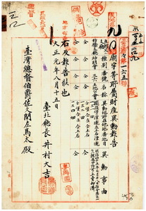 三四 台北庁枋橋支庁擺接堡潭茄庄神明会土地公会・大加蚋堡三板橋庄神明会媽祖会・滬尾支庁小八里戒庄神明会会堂宮ノ所属財産異動ニ付キ台北庁長井村大吉ヨリ報告ノ件