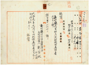 七 新竹庁九崇林庄所在ノ文林閣管理人劉家水及ヒ信徒総代ノ劉陳光ト林阿際ヨリ出願ノ文林閣所属ノ土地ヲ九崇林公学校増築費ニ充テル為メ処分方許可ノ件(指令第二二七〇号)