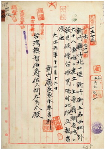 二四 新竹庁竹北一堡新竹街所在ノ上帝廟調査洩発見ニ付キ新竹庁長家永泰吉郎ヨリ報告ノ件