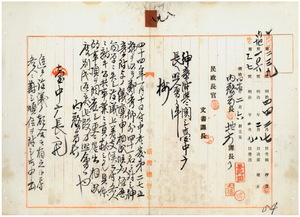 八 台中庁管内師東下堡上石牌庄廖登渭・師東下堡二け埔庄頼汲修・藍興堡大里杙街林文華・師東下堡上楓樹脚庄張泉源・大肚中堡竹林庄陳添丁・大肚下堡塗葛堀庄張錦上・燕霧下堡大庄頼紹堯・線東堡彰化街ノ李崇礼・楊煥彩・二林下堡二林庄蔡登堂・馬芝堡鹿港街ノ施受業・蔡敦波、苗栗三堡大甲街ノ杜清・朱麗、馬芝堡三塊鮎庄李聲洲ニ紳章付与ニ付キ内務局長亀山理平太ヨリ台中庁長枝徳二ヘ通達ノ件