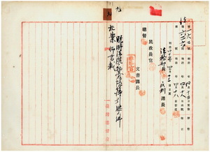 九 臨時法院ノ物品及帳簿記録ヲ其ノ目録ヲ添ヘ覆審法院ヘ引継(内訓第六号)・臨時法院ノ物品及帳簿ヲ其院ニ於テ引継(内訓第七号)・臨時法院ノ刑事訴訟記録ヲ覆審法院検察局ヘ引継方覆審法院検察官長代理早川弥三郎ト覆審法院長代理高田富蔵ヨリ報告ノ件(内訓第八号)
