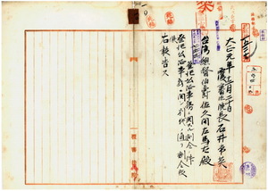 一〇 登記公証事務ニ関シテハ大正元年八月三日付庶日第一二三九号訓令登記所事務規程中第六八条「登記事務ハ十二月三十日マテ之ヲ取扱フヘシ但三十日カ日曜日ニ当ルトキハ二十九日マテトス」及ヒ第五章公証第一七一条「第六十四条第六十五条第六十八条第六十九条第八十一条第百二条ノ規定ハ本章ニ之ヲ準用ス」ノ規定ニ依ル旨登記官庁ヘ訓令シタルニ付キ覆審法院長石井常英ヨリ台湾総督佐久間左馬太ヘ報告ノ件