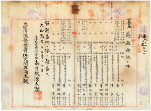一 台北監獄長台湾総督府典獄志豆機源太郎ヨリ無期徒刑囚ノ潘毛・張良、有期徒刑囚陳聯輝、軽懲役囚李和尚、重懲役囚王塗、懲役囚蘇江淮、重懲役囚陳可コト陳考鵠、有期徒刑囚沈惷山コト黄催山、重懲役囚黄栄、懲役囚ノ徐新旺・李伝ヲ恩赦釈放シタル旨台湾総督佐久間左馬太ヘ報告ノ件