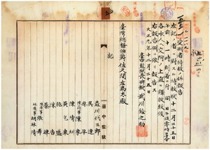 五 台中監獄長台湾総督府典獄武川銓之助ヨリ受刑者ノ森川代三郎・呉連・廖平・陳蒋事陳象・陳清嘩・黄乞来・施盛・陳告・蔡律・陳希事張希・林清事胡林清ヲ特赦釈放シタル旨台湾総督佐久間左馬太ヘ報告ノ件