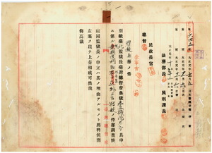 一 台北監獄長台湾総督府典獄志豆機源太郎ノ特赦申立ニ依リ有期徒刑囚游査某(匪徒刑罰令違反罪初犯・有期徒刑一五年・台北地方法院宜蘭出張所明治三四年一〇月二四日判決・同日執行・刑ノ終期大正五年一〇月二三日)ノ刑ノ執行免除、懲役囚林氏阿金(放火罪初犯・懲役二年六月・台北地方法院宜蘭出張所明治四三年一二月二七日判決・明治四四年一月五日執行・刑ノ終期大正二年七月四日)ノ刑ノ執行免除、懲役囚陳阿九(傷害致死罪初犯・懲役二年六月・台北地方法院宜蘭出張所明治四三年九月二九日判決・同年一〇月五日執行・刑ノ終期大正二年四月四