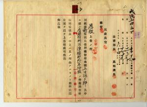 五 台南監獄長台湾総督府典獄上田孫三郎ノ特赦申立ニ依リ有期徒刑囚陳福那(持兇器強盗罪初犯・有期徒刑一五年・台南地方法院鳳山出張所明治三四年一二月二七日判決・同日執行・刑ノ終期大正五年一二月二三日)ノ刑ノ執行免除、重懲役劉最先囚(殴打致死罪初犯・重懲役九年・台南地方法院明治三八年二月二七日判決・同日執行・刑ノ終期大正三年二月二六日)ノ刑ノ執行免除ニ付キ恩赦上奏裁可執行ノ件