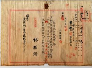 八 台北庁大龍斤公学校朱鮎崙分校勤務台北庁雇公学校訓導林諸礼(本居地台北庁大加蚋堡大稲花飲和街)ヨリ公学校訓導無試験検定出願ニ付キ免許状授与ノ件