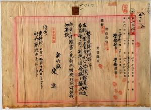 一一 樹砥林街長春医院助手ニシテ公学校訓導免許状ヲ有スル宋進(本居地新竹庁竹北一堡十二椙庄土名十椙坑)ヨリ公学校訓導無試験検定出願ニ付キ免許状授与ノ件