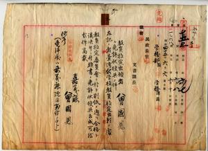二 嘉義庁梅仔坑公学校雇曽国恩(原籍地嘉義庁他里霧堡杉荳園庄)ヨリ台湾公学校訓導教員無試験検定出願ニ付キ免許状授与ノ件