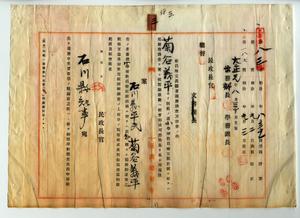 三 石川県金沢市芳斎町尋常小学校訓導菊谷義平(原籍石川県金沢市森下町・石川県師範学校卒)ヨリ尋常小学校本科正教員無試験検定出願ニ付キ免許状授与ノ件