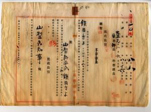 二 山梨県師範学校卒業山梨県東山梨郡岡部尋常高等小学校訓導鎮目きよ(本籍地山梨県東山梨郡岡部村字鎮目)・山梨県師範学校卒業山梨県東山梨郡日川第一農業補習学校訓導鎮目滋平(本籍地山梨県東山梨郡岡部村字鎮目)ヨリ台湾小学校本科正教員無試験検定出願ニ付キ教員免許状授与ノ件尚鎮目きよト滋平ハ夫婦ナリ