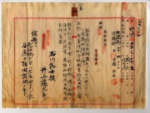 三 石川県小学校本科正教員免許状ヲ有スル石川県羽昨郡高浜尋常高等小学校訓導兼校長井上藤太郎(本籍地石川県羽昨郡富来村字地頭町・石川県尋常師範学校卒)ヨリ尋常小学校本科正教員無試験検定出願ニ付キ免許状授与ノ件