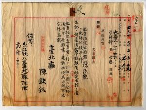 五 台湾総督府国語学校国語部卒業及ヒ三年以上公学校雇教員奉職ニヨリ台北庁大稲花公学校雇陳欽銘(本居地台北庁大加蚋堡大龍斤街土名大龍斤)ヨリ台湾公学校訓導無試験検定出願ニ付キ免許状授与ノ件