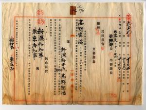 七 新潟県小学校本科正教員免許状ヲ有スル嘉義庁蒜頭尋常小学校勤務嘉義庁雇高野富治(本籍地新潟県古志郡四郎丸村大字川崎・新潟県高田師範学校卒)ヨリ尋常小学校本科正教員無試験検定出願ニ付キ免許状授与ノ件