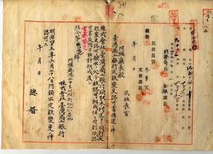 八 株式会社台湾商工銀行取締役頭取木村匡(阿緱庁港西中里阿緱街)ヨリ出願ノ株式会社台湾商工銀行定款変更認可及ヒ認可書伝達ノ件(指令第三〇二七号)