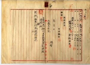 一四 株式会社台湾商工銀行取締役頭取木村匡(阿緱庁港西中里阿緱街)ヨリ出願ノ株式会社台湾商工銀行阿緱支店設置登記済届ニ付キ大蔵大臣ヘ進達ノ件