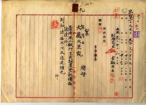 一九 株式会社台湾商工銀行取締役木村匡(台北庁大加堡台北城内文武街)ヨリ花蓮港庁蓮郷花蓮港街高砂通ニ花蓮港支店ヲ設置登記済届出ニ付キ大蔵大臣ヘ進達ノ件