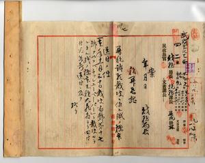 七 大正元年一一月三〇日関税訴願裁決番号第一七号ヲ以テ裁決セラレタル紙ノ標本三種ヲ大蔵省関税局長桜井鉄太郎ヨリ送附ニ付キ台湾総督府税関長ヘ送附ノ件