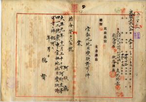 五 阿緱庁長佐藤謙太郎ヨリ稟申ノ同庁崇徳東里狗認氤庄ノ官租地ノ地目ヲ畑カラ建物敷地ヘ変換ニ付キ認可ノ件(指令第三〇八五号)