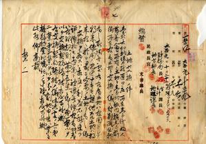 七 台北庁長井村大吉ヨリ副申ノ台湾婦人慈善会会長内田りんヨリ願出ノ台北庁大加蚋堡龍匣口庄ノ所有地ト大加蚋堡台北城内撫台前街ノ官有地ノ交換ニ付キ契約締結並ニ土地保存登記及業主権移転登記結了ニ付キ台北庁ヘ通知ノ件
