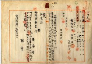 一二 台南庁善化里西堡曽文庄荘欄(荘燈)及ヒ善化里東堡小新営庄林老知(林閙知)ヨリノ土地台帳登録氏名訂正方台南庁長松本茂俊ヨリ稟申ニ付キ認可ノ件(指令第五三号)