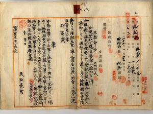 八 本島ノ旧慣ニ依ル合股ヲ土地業主又ハ典主トシテ登記セラルル場合ニハ地租徴収上必要ニ付キ其ノ合股ノ管理人(董事ノ類)ヲモ併セテ登記シ土地台帳所管庁ニ対スル登記済通知書ニハ合股名ノ外ニ管理人ノ住所氏名ヲモ併記スルトノ案ニ付キ覆審法院長ヘ照会並ニ覆審法院長石井常英ヨリ本案ノ通リトノ覆照アリタルニヨリ登記通知ニ依ヨリ合股ヲ土地台帳ニ登録方ニ関シ各庁長ヘ(台東・花蓮港・澎湖庁ヲ除ク)民政長官ヨリ通達ノ件