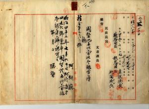 一六 阿緱庁長佐藤謙太郎ヨリ稟申ノ鄭氏倹ヘ阿緱庁嘉祥内里牛稠埔庄ノ畑ヲ開墾地土地台帳登録方認可ノ件(指令第三三八三号)