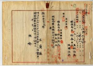 一 宜蘭庁長小松吉久ヨリ稟申ノ宜蘭庁管内ニ於テ張純厚ヘ員山堡新城庄土名鎮平ノ畑、林如ヘ同堡同庄同土名ノ畑、江阿段・江水盛・江松茂ヘ同堡同庄同土名ノ畑、李裕ヘ同堡同庄同土名ノ畑、陳旺ヘ同堡同庄同土名ノ畑、周家儒ヘ同堡同庄同土名ノ畑、羅鹿皮ヘ同堡同庄同土名ノ田・畑、林長木ヘ同堡同庄同土名ノ田、洪坤池ヘ同堡同庄同土名ノ田・畑、甘上清・甘石火ヘ同庁同堡内員山庄土名中和ノ畑、陳朝蒜ヘ同堡同庄同土名ノ畑、陳鑑池・陳裕後ヘ同堡同庄同土名ノ畑、陳楊合・管理陳其華ヘ畑、陳栄源ヘ同堡同庄同土名ノ畑、陳鳳鳴ヘ同堡同庄同土名ノ畑