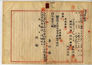 一六 台北庁長井村大吉ノ稟申ニ依リ呉昌戈ヘ台北庁下ノ大加蚋堡下響庄土名中石路ノ建物敷地、国庫(高等女学校保管)ヘ同堡龍匣口庄ノ建物敷地、等々力智恵太ヘ同堡同庄ノ畑、黄有土ヘ同堡大稲花朝東街ヘ建物敷地、大稲花女子公学校管理台北庁長ヘ同堡大稲花獅館巷街ノ建物敷地、渋谷嘉助ヘ同花下圭府聚街ノ建物敷地、木村謙吉ヘ同堡大稲花頂圭府聚街ノ建物敷地、張達源・顔雲年ヘ基隆堡基隆街土名草店尾ノ建物敷地、許梓桑ヘ同堡同街土名媽租宮口ノ建物敷地ノ開墾地土地台帳登録方認可ノ件(指令第四二一号)