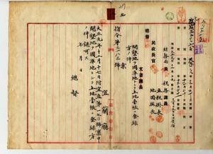 七 宜蘭庁長小松吉久ヨリ稟申ノ宜蘭庁紅水溝堡阿兼城庄土名救救ノ畑ノ開墾地ヲ国庫地トシテ土地台帳ニ登録方認可ノ件(指令第三一八三号)