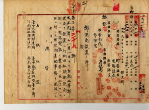 二 大正元年一一月一日ヨリ三等郵便局トシテ台中大卸街郵便局ト打狗哨船頭郵便局ヲ設置スル件(告示第三九号)明治四四年一〇月訓令第一七四号(電信回線表、電報中継順路表、局報順送表)別冊中改正ノ件(訓令第四八号)打狗哨船頭郵便局電報取扱種別ヲ内国、日清和欧文電報及外国電報ト定ムルノ件(告示第四〇号)台中ハ発展ニ伴ヒ市内郵便局ヲ増設スルヲ要シ打狗ハ本局移転ニ伴ヒ重ナル官衙会社等ノアル哨船頭ニ機関ナキニヨル三等郵便局ノ設置、明治四四年訓令第一七四号改正、電報取扱種別ニ付キ逓信大臣ヘ報告ノ件打狗哨船頭郵便局ノ電報伝送上ノ名称ヲ哨船頭トスル件打狗哨船頭郵便局ノ羅馬字綴リヲ^Shosento^トスルコトニ付キ通信局長ヨリ逓信省通信局長ヘ通知ノ件本件ニ関スル電報文等関係書類一括綴込