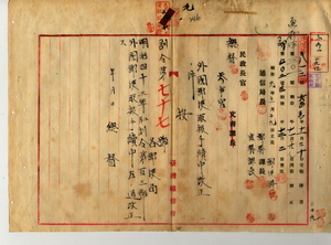 九 明治四三年五月訓令第一〇三号外国郵便取扱手続中改正ノ件(訓令第七七号)本件外国郵便取扱手続中改正ニ付キ逓信大臣ヘ報告ノ件台中市街図(明治四三年九月台中庁)一葉あり(誤綴)。