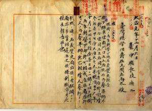 二一 被貸下人蔡弄獅死亡ニ付キ相続人蔡彬ヨリ植樹ノ為メ台中庁線東堡南門口庄ノ官有原野年期貸下地ノ名義変更願許可ニ付台中庁長西徳二ヨリ報告ノ件
