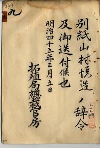 九 台湾総督府民政部殖産局長高田元治郎ノ具申ニ依リ大目降糖業試験場勤務台湾総督府民政部殖産局技師山村悦造ニ土性、肥料、甘藷品種改良、糖蜜利用及一般糖業ニ関スル調査ノ為メハワイ・キューバ・米国ニ派遣ヲ命シ支度料三五〇円ヲ支給ス