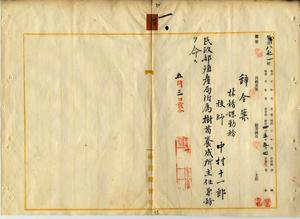 一〇 台湾総督府民政部殖産局長高田元治郎ノ具申ニ依リ民政部殖産局林務課勤務台湾総督府技師中村十一郎ニ民政部付属樹苗養成所主任兼務ヲ命ス