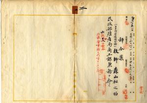 二 台湾総督府民政部殖産局長高田元治郎ノ具申ニ依リ民政部土木局営繕課勤務台湾総督府技師森山松之助ニ民政部殖産局商工課兼務ヲ命ス[誤綴、七文書の本文二丁と電報用紙一枚あり]