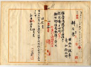 一二 新竹郵便局長岩下巳之助ノ内申ニ依リ新竹郵便局傭ノ田之上政幸・青山尚之助ヲ台湾総督府通信手ニ任シ新竹郵便局勤務ヲ命ス