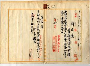 一九 台湾総督府台中庁長枝徳二ノ内申ニ依リ台中庁属佐々木武雄ヘ罹病ニ因リ内地ヘ転地療養中ナルモ速ニ全治ノ見込ナキ為メ文官分限令第一一条第一項第四号ニ依リ休職ヲ命ス