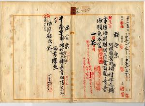 三三 阿緱庁警務課勤務阿緱庁警部補畑村峰之助ハ麻刺里亜ニ罹リ職ニ堪ヘサル旨ヲ以テ辞職願ニ依リ本官ヲ免シ事務格別勉励ニ付キ一時金ヲ賞与ス