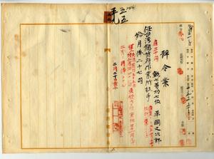 五五 台湾総督府作業所長賀来佐賀太郎ノ内申ニ依リ台湾総督府作業所雇平岡又次郎ヲ台湾総督府作業所技手ニ任ス