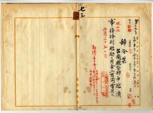 七三 大目降支庁長及台南庁警部中越清ハ疾病ニ罹リ危篤ニ瀕シ台南庁長松木茂俊ニ依リ賞与ノ儀ニ付キ稟申シタルモ死去(二月二五日)シタル為メ事務格別勉励ニ付キ一時金ヲ賞与ス