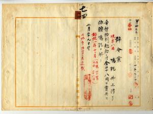 七四 蕃人教化事務嘱託井上僧了ハ疾病ニ罹リ内地寺経営ノ為メ辞職ヲ願ヒ出タルヲ以テ嘱託ヲ解キ、事務格別勉励ニ付キ一時金ヲ賞与ス