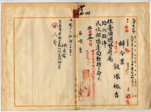 四 台湾総督府民政部殖産局長高田元治郎ノ具申ニ依リ飯塚祗吉ヲ台湾総督府属ニ任シ民政部殖産局勤務ヲ命ス